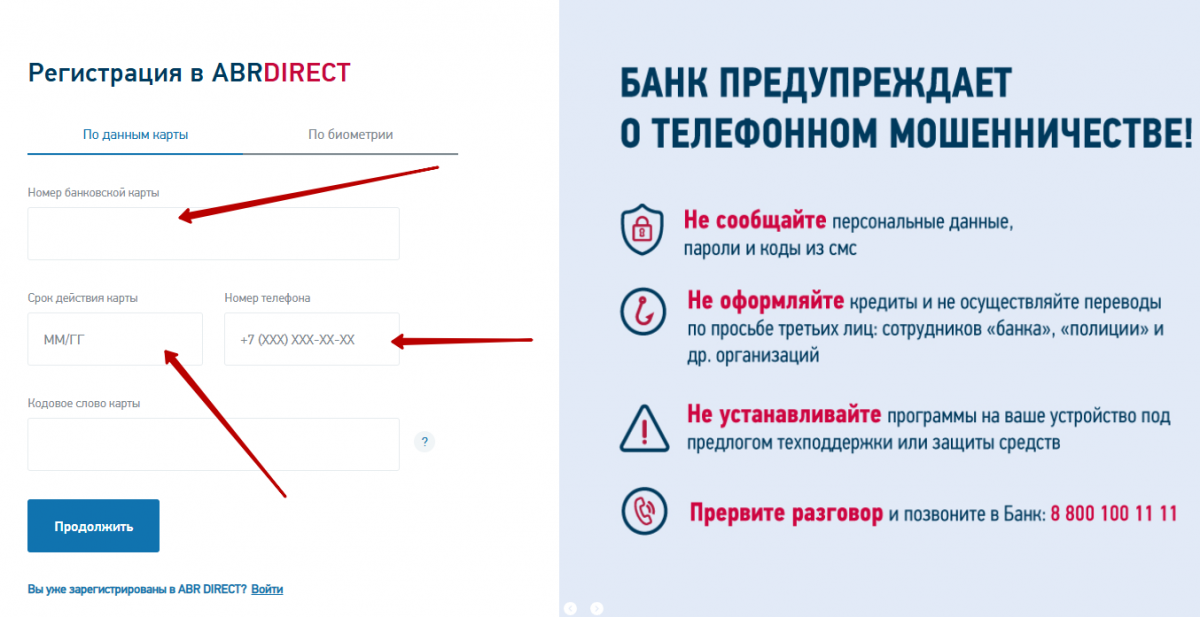 Держатели пластиковых карт могут зарегистрироваться в личном кабинете в онлайн-режиме, на официальном сайте банка. Заходим на страницу i.abr.ru или кликаем на кнопку «Войти в Интернет-банк» (она расположена справа на главной странице) и в открывшемся окне выбираем кнопку «ABR DIRECT». Далее нажимаем «Зарегистрироваться». Заполняем форму регистрации, в соответствующие ячейки вводим:
