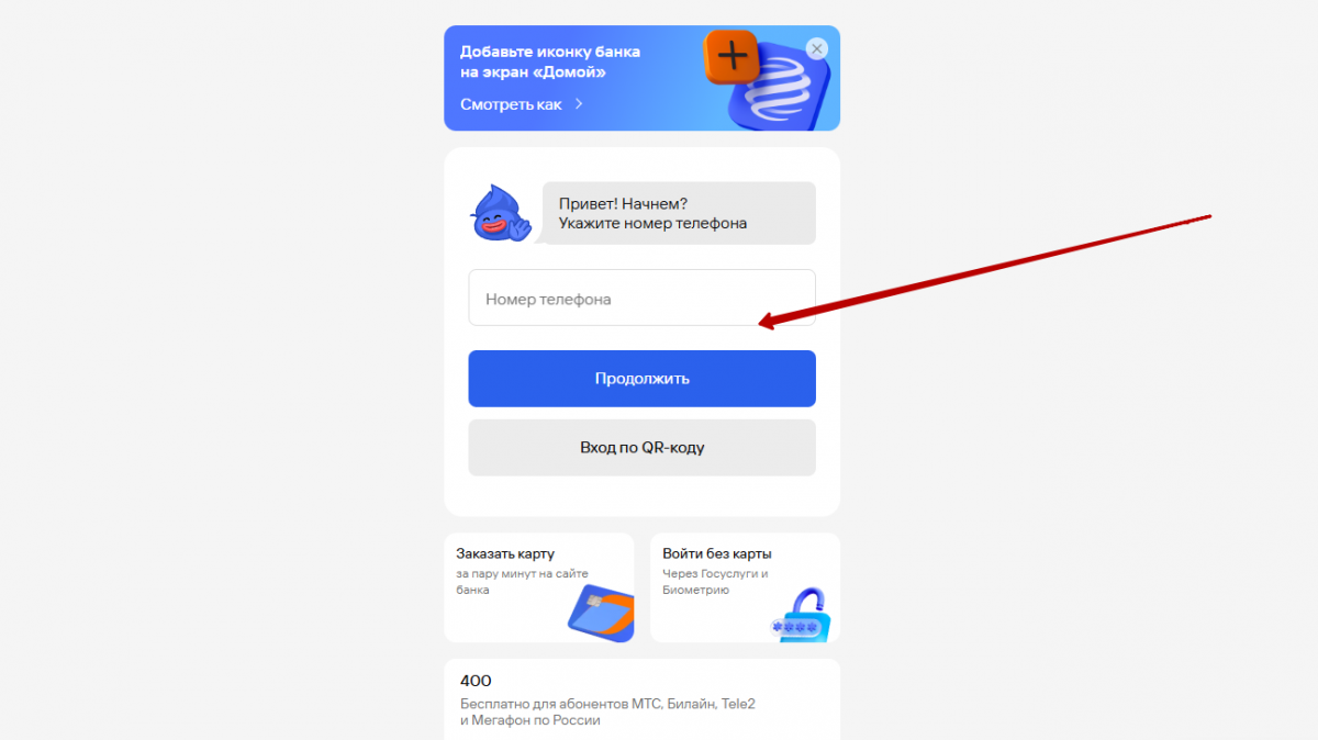 - Впишите в соответствующее поле телефонный номер, к которому привязана карта