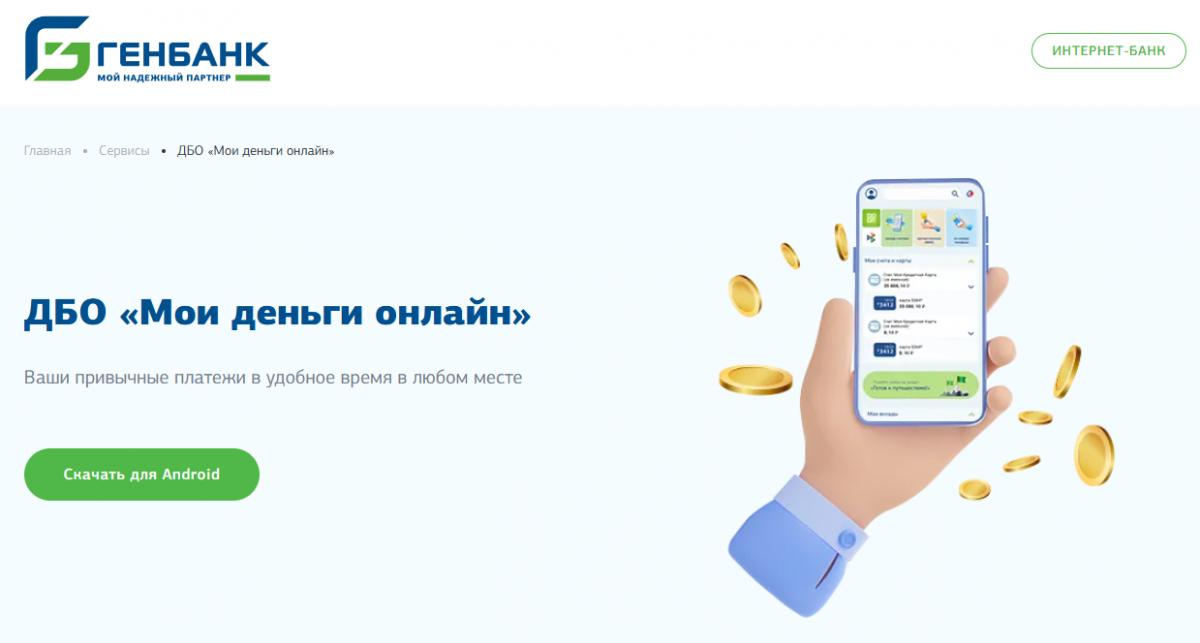 Сервис позволяет управлять счетами, картами и вкладами с любого смартфона и планшетного устройства на платформе Android и iOS. Функционал мобильного банка полностью совпадает с возможностями интернет-версии. Пользователи могут открывать и закрывать карты, погашать кредиты, получать информацию о доходах и расходах по счетам. Для использования приложения «Генбанк Онлайн» его нужно бесплатно скачать из магазина приложений RuStore или на официальном сайте банка на странице: genbank.ru/services/tsifrovoy-genbank.