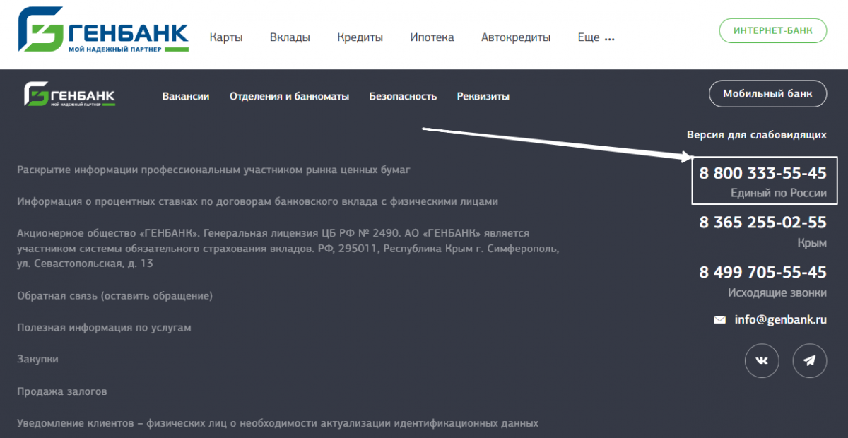 В Генбанке работает служба поддержки клиентов по бесплатному номеру телефона: 8 (800) 333–55–45 (звонки доступны по РФ). Жители Крыма могут позвонить на горячую линию региона: 8 (365) 255–02–55.