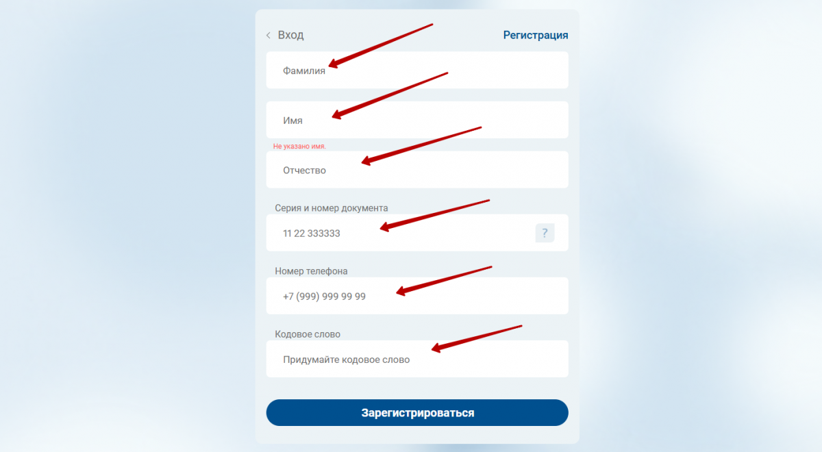 - Укажите номер мобильного телефона, серию и номер паспорта