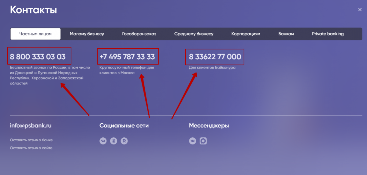 Задать любой вопрос, связанный с банковским обслуживанием или с работой личного кабинета можно по телефону «горячей» линии. Для связи с представителем Промсвязьбанка используйте: