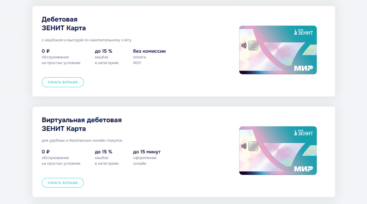 - «Зенит» – кэшбэк до 50% в категориях, 15% по накопительному счету, выпуск дополнительной карты