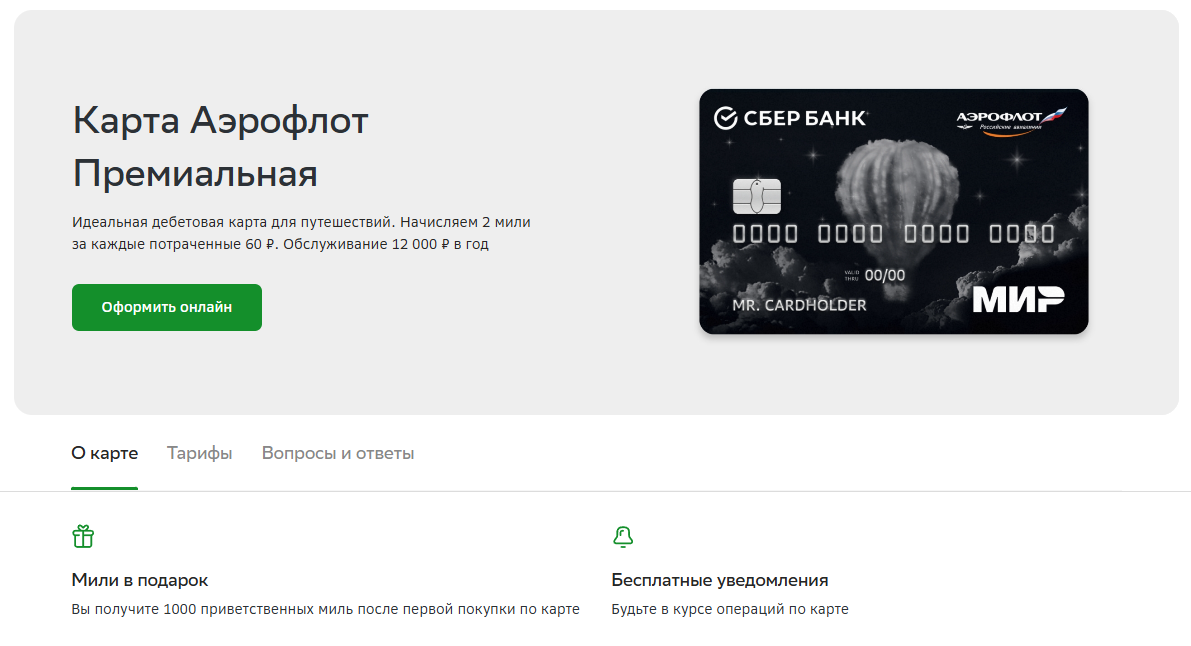 Дебетовая карта Аэрофлот Премиальная Сбербанка