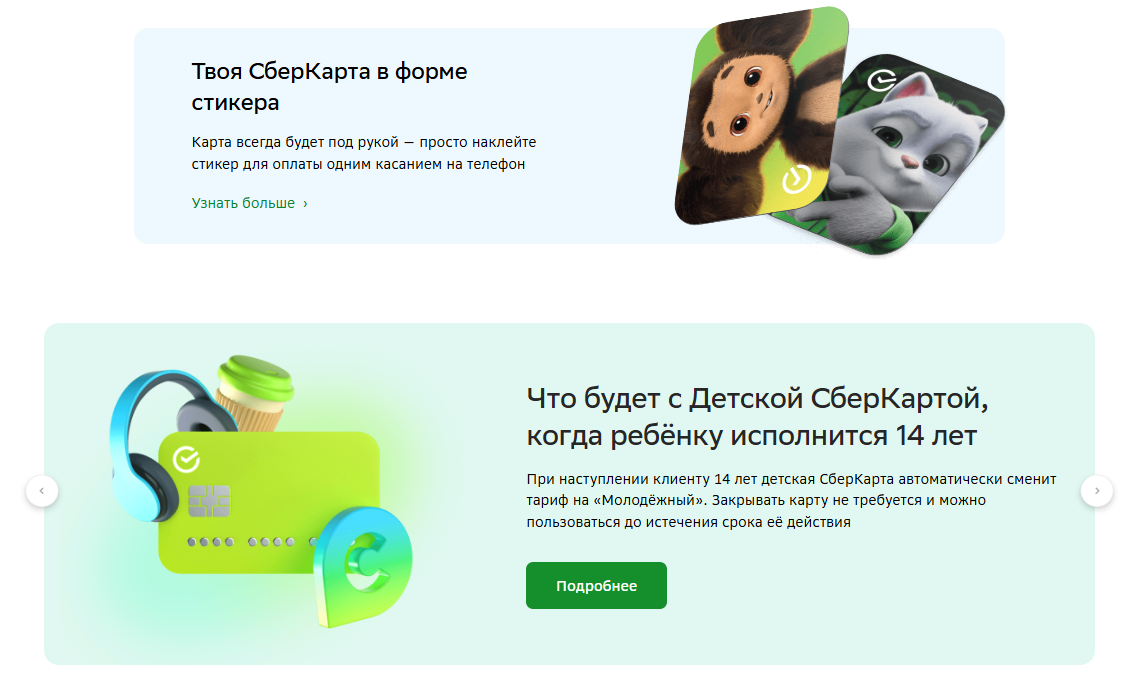 Детская банковская карта от Сбербанка с бесплатным обслуживанием помогает научить ребенка контролировать свои траты и делать сбережения. Сберкарта выпускается для детей с 6 до 13 лет, привязывается к карте одного из родителей. После оформления она будет доступна в мобильном приложении СберБанк Онлайн, а родители смогут контролировать баланс счета и настраивайте лимиты на покупки. Доступно 6 видов дизайна, которые можно выбрать перед подачей заявки на выпуск.