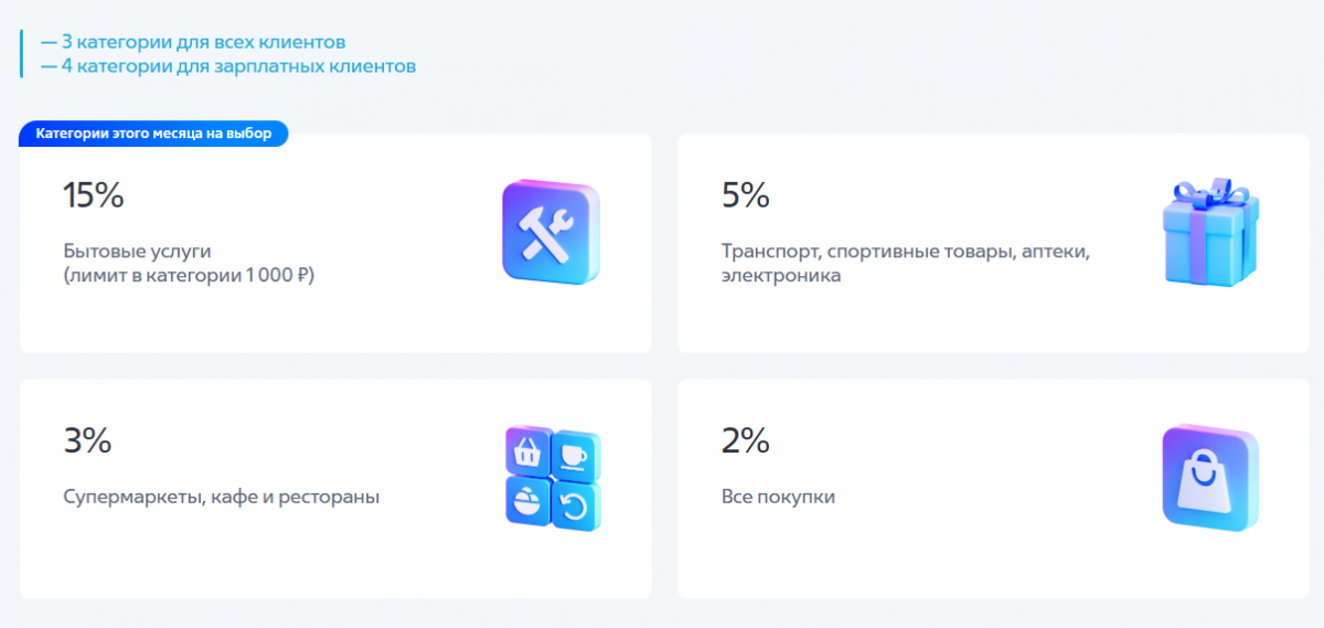 - До 5% - каждый месяц в 3-х выбранный категориях