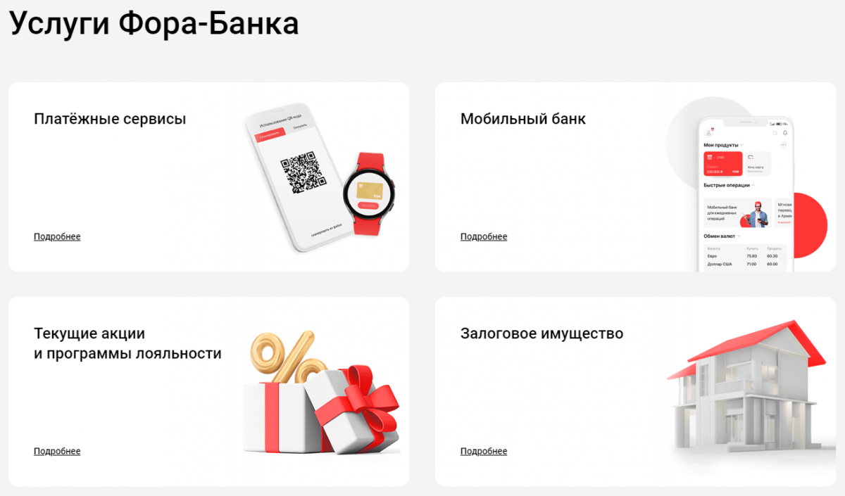 Данная программа привилегий для клиентов позволяет получать кэшбэк и скидки до 35%. Подробные условия получения бонусов можно посмотреть в личном кабинете или на официальном сайте банка. Программа лояльности Фора-Бонус распространяется на покупки в категориях: