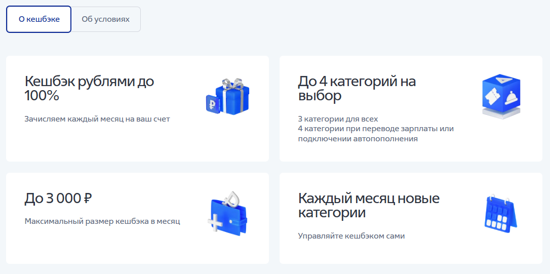 Ежемесячно доступно до 4-х категории на выбор: 3 для всех и 4 категории для зарплатных клиентов. Владельцы карт со сбережениями более 50000 рублей могут выбрать специальные категории кэшбэка, помеченные знаком «звездочка». Дополнительный возврат средств по программе Мультибонус - до 15% за покупки у партнеров: маркетплейсы, путешествия, одежда и обувь, косметика, техника, электроника и многое другое. Для стандартных покупок – 5% кэшбэка каждый месяц.