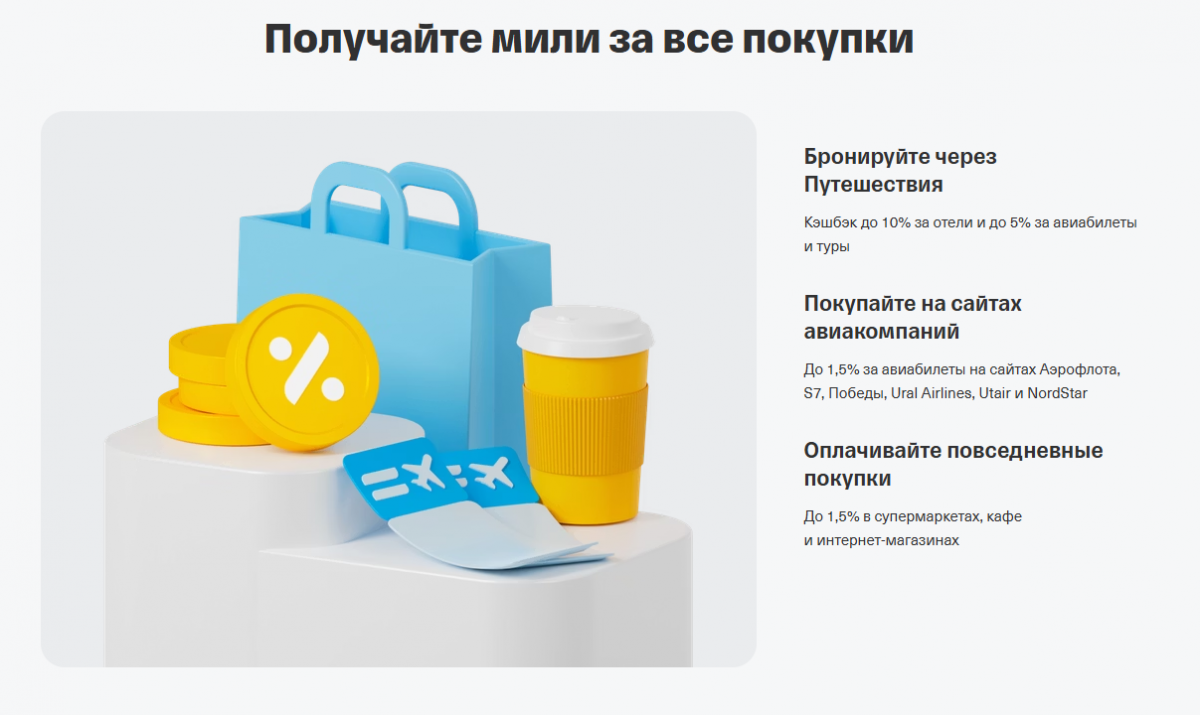 При приобретении билетов на сайтах компаний Аэрофлот, Победа, Уральские авиалинии, S7, Utair начисляется 1,5% от потраченной суммы. При совершении покупок у партнеров по действующим специальным предложениям начисляется кэшбэк до 30%. Деньги за приобретенные билеты на самолет возвращаются с помощью накопленных миль, которые можно обменять. Для компенсации стоимости покупки должен сохраняться минимальный доступный остаток 6000 миль. При списании миль в счет погашения стоимости билета, услуг стоимостью до или более 6000 рублей сумма округляется до 6000, 9000, 12000 миль и т. д. с шагом 3000.