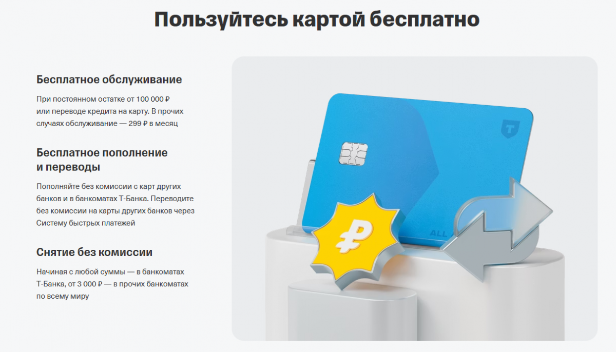 За снятие до 500 тысяч рублей за расчетный период в банкоматах Т-Банк комиссия не удерживается. В банкоматах сторонних банков можно обналичивать бесплатно до 100 тысяч рублей ежемесячно при условии, что сумма одной операции более 3000 рублей. При превышении лимитов или снятии за один раз менее 3 тысяч рублей предусмотрена комиссия 2%, но не меньше 90 рублей. Переводы до 20000 рублей на карты других российских банков - бесплатно, свыше этого лимита - 1,5% от превышения, но не меньше 30 рублей.