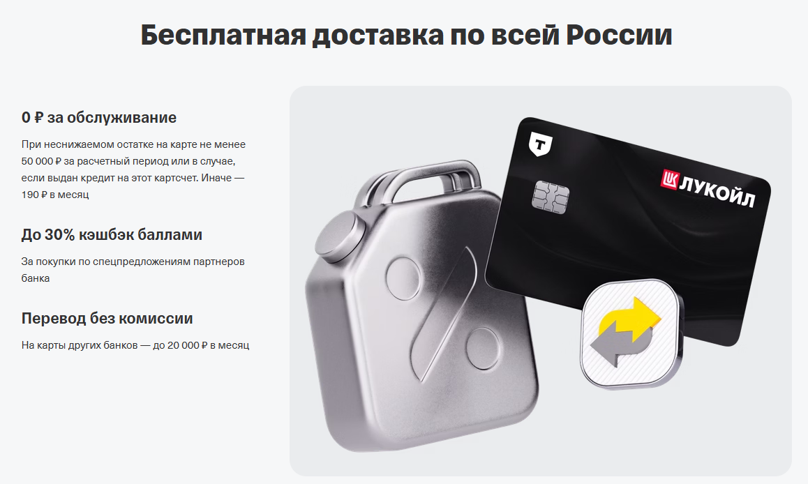 Карта Т-Банк Лукойл позволяет получать бонусы за покупку топлива на АЗС компании. Часть потраченных денег вернется баллами на карту лояльности Лукойл, которыми можно расплатиться за бензин по курсу 100 баллов = 1 рубль. Переводы без комиссии на карты других банков до 20000 рублей. Бесплатное обслуживание при неснижаемом остатке на карте не менее 50000 рублей за расчетный период или в случае, если выдан кредит на этот карточный счет.