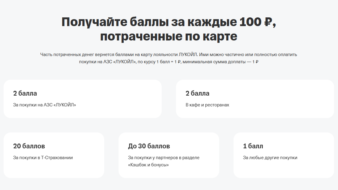 Дополнительно к кэшбэку за покупки получайте баллы по программе лояльности «Заправься выгодой». Часть потраченных денег вернется баллами на карту лояльности. Ими можно частично или полностью оплатить топливо на АЗС «Лукойл», по курсу 1 балл = 1 рубль.