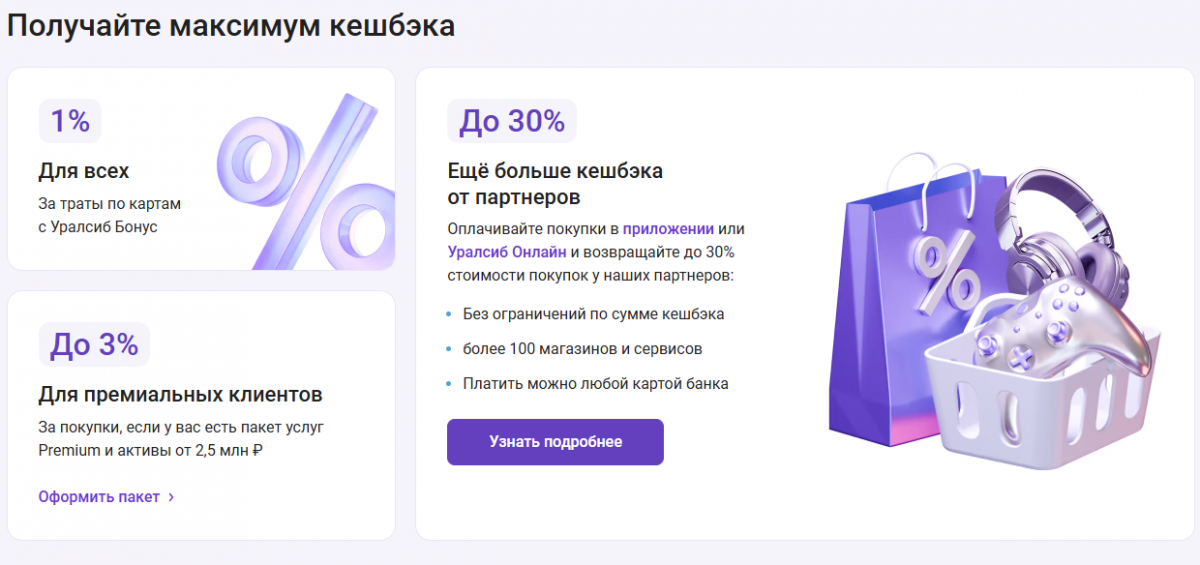 Кредитная карта с кэшбэком от Уралсиб – это возможность сэкономить на покупках и получить возврат денежных средств при тратах в магазинах-партнерах банка. По кредитке действует льготный период в 120 дней, а плата за обслуживание не взимается при тратах более 10 тысяч рублей в месяц. Максимальный лимит кредитования – 1,5 миллиона рублей. Процентная ставка вне грейса составляет от 19,9% годовых в рублях.