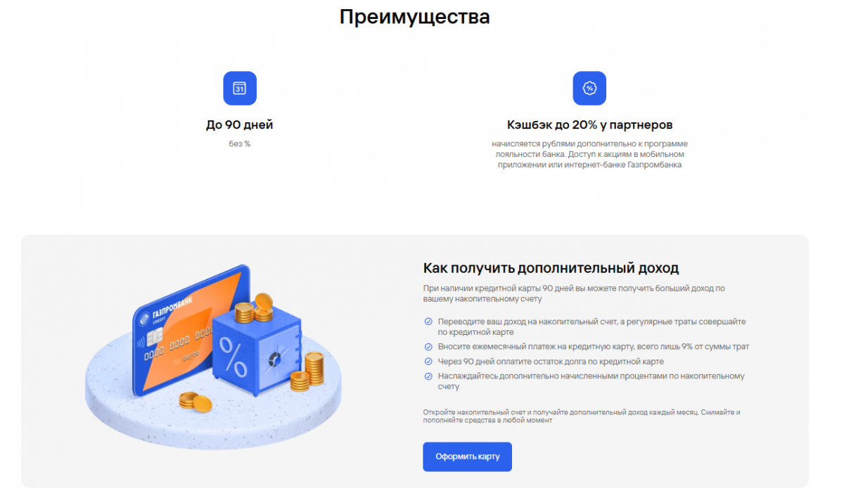 Кредитная карта Кэшбэк от Газпромбанк позволяет оплачивать товару и услуги, получать кэшбэк в размере 5% на покупки и пользоваться беспроцентным периодом до 90 дней. Выпуск кредитки и обслуживание в первый год - бесплатно. Обязательный платеж по кредиту составляет 3% от суммы задолженности в месяц, но не менее 300 рублей.
