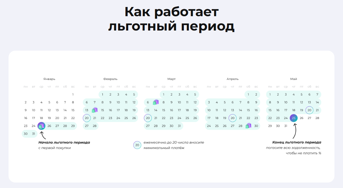 Льготный период 120 дней без % по кредитной карте «Своя» начинает действовать с первой покупки. Ежемесячно нужно вносить обязательный минимальный платеж, чтобы грейс продолжал действовать, и не сформировалась просроченная задолженность. Например, если вы активировали карту 10 августа, то льготный период продлится до 10 декабря (день, когда вы должны погасить весь долг по кредитке). Минимальный платеж нужно вносить в начале каждого месяца с 1 по 20 число. При полном погашении задолженности новый льготный период начнётся со следующей покупки.