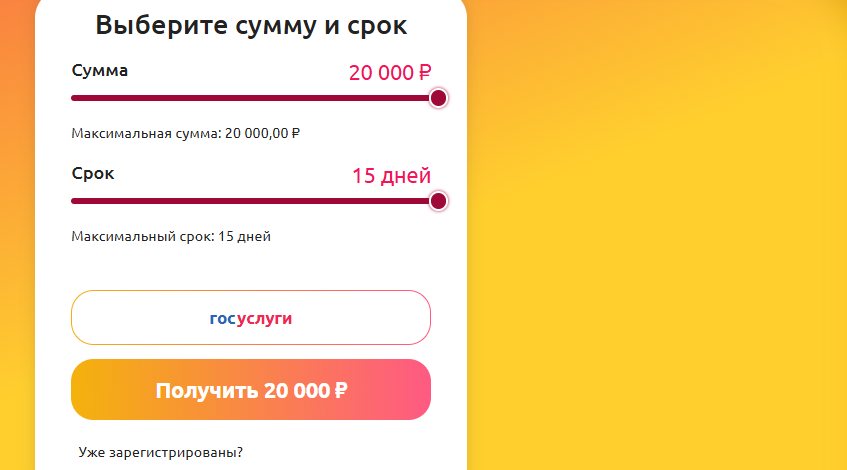 Сумма Срок Одобрение 2000 - 30 000 ₽ 7 - 30 дней 83% Ставка ПСК Возраст 0 - 0,8% в день 0 - 292,000% в год 18 - 75 лет Повторно Время Продление 2000 - 30 000 ₽ 2 минуты Да - 0%
