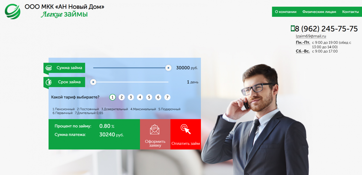 Своим клиентам микрокредитная компания АН Новый Дом предлагает займы на срок до 1 года с максимальным лимитом до 100 000 рублей. Процентная ставка устанавливается индивидуально в пределах от 0,3% до 0,8% в день. Для пенсионеров действуют специальные условия по ежедневной ставке 0,65% или 237,900% годовых.