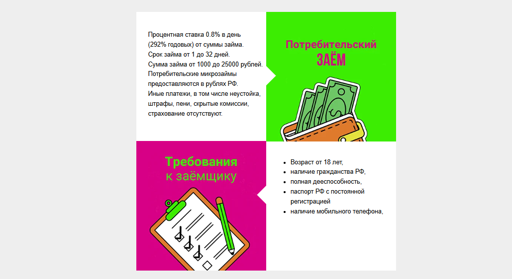 Сумма Срок Одобрение 1500 - 15 000 ₽ 5 - 126 дней 33% Повторно Ставка ПСК До 100 000 ₽ 0 - 0,8% 0 - 292,000% Возраст Ответ Продление 18 - 70 лет 1 минута Да Быстрая регистрация Госуслуги Документы Паспорт РФ, ИНН, СНИЛС Время работы Круглосуточно Способы получения На карту, СБП Погашение Картой Штрафы и пени До 20% годовых от суммы долга Личный кабинет Войти