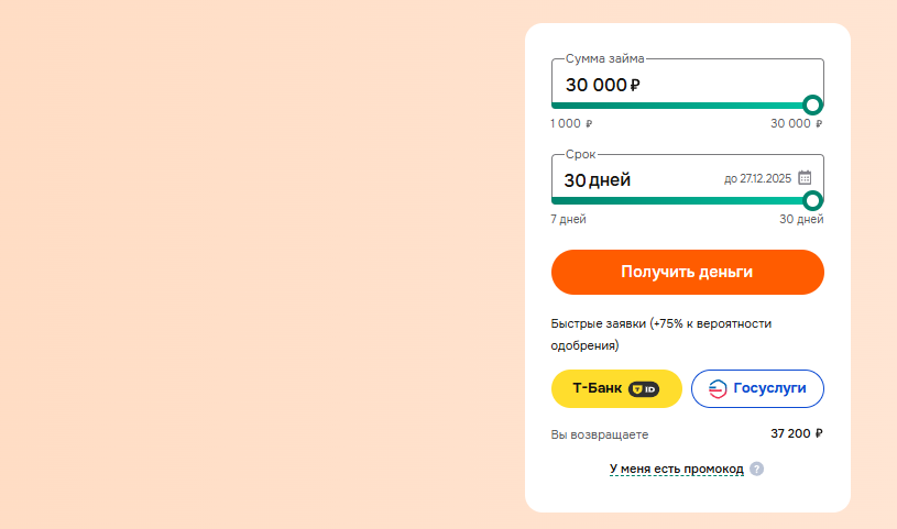Сумма Срок Одобрение 3000 - 30 000 ₽ 7 - 180 дней 83% Ставка ПСК Возраст 0 - 0,8% в день 0 - 292,000% в год 18 - 65 лет Повторно Время Продление 3000 - 49 000 ₽ 1 минута Да - 0%