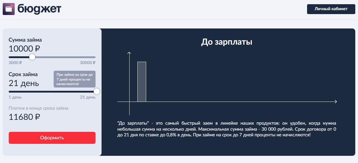 Микрофинансовая организация Бюджет выдает займы физическим лицам по одному документу в размере от 30.000 до 60 000 рублей по ставке от 0,5% до 0,8% в день. Воспользоваться предложением могут граждане в возрасте с 18 лет с постоянной регистрацией в любой регионе РФ. Деньги переводятся на банковскую карту или электронный кошелек, а также по СБП.