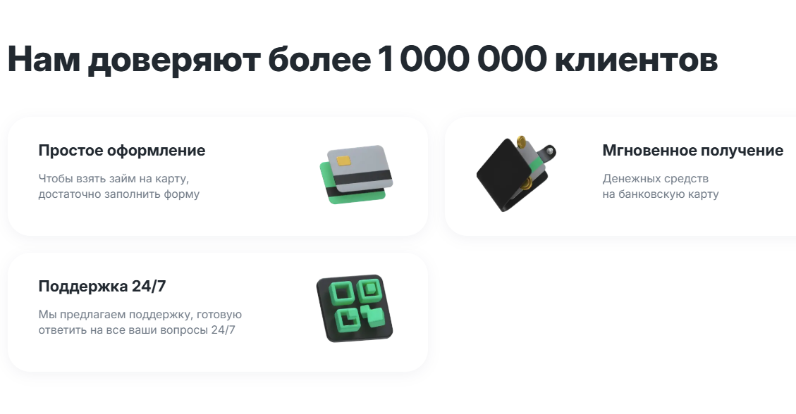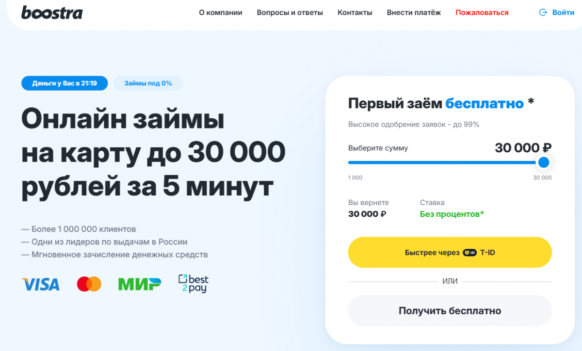 Микрофинансовая организация Бустра выдает онлайн займы на карту любого российского банка без отказа, проверок и дополнительных комиссий. Компания действует от лица МКК «Финлаб» (свидетельство о государственной регистрации № 2303336009950 от 2023 года), МКК «Аквариус» (номер в реестре МФО – 2303336009950 от 2023 года), и МКК «ВипЗайм», зарегистрированной под № 2403045010029 в 2024 году. Все организации состоят в профильной СРО, поэтому интересы клиентов защищены на законодательном уровне. Деньги в долг можно получить на личные цели, с любой кредитной историей круглосуточно даже в праздничные и выходные дни.