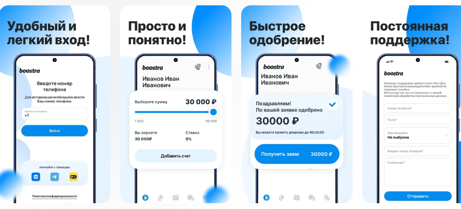Скачать и установить бесплатное мобильное приложение Бустра на смартфон с ОС Android и iOS для подачи заявки на займ, отслеживания ее статуса и погашение задолженности перед микрофинансовой организацией.