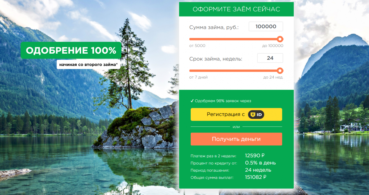 Сумма Срок Одобрение 3000 - 30 000 ₽ 10 - 168 дней 74% Повторно Ставка ПСК До 100 000 ₽ 0 - 0,8% 0 - 292,000% Возраст Решение Продление 18 - 71 лет 5 минут Да - 0%