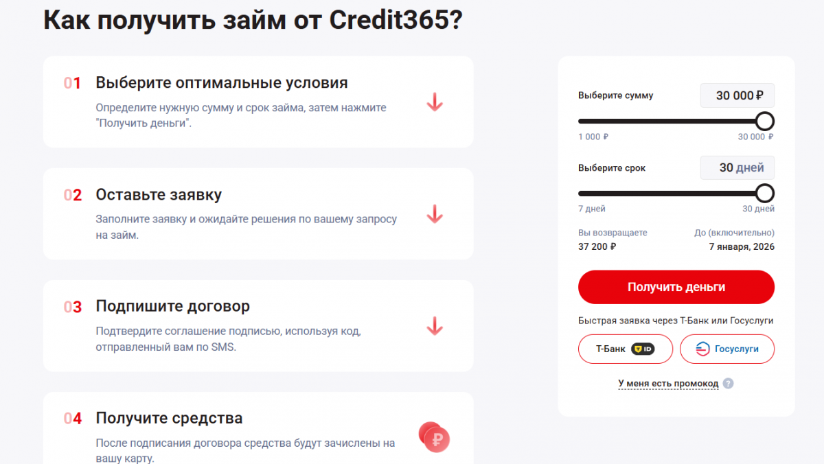 - Нажмите на «Получить деньги» и перейдите на сайт: credit365.ru