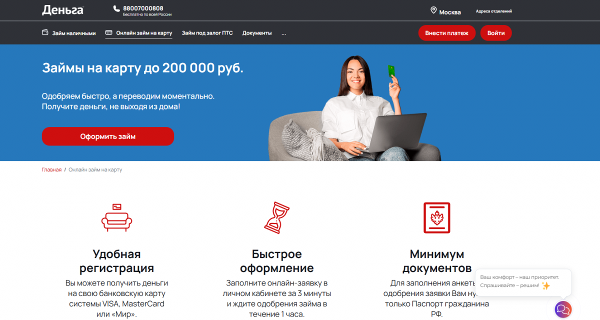 В МФО Деньга можно оформить онлайн займ на карту от 1000 до 200.000 рублей сроком до 180 дней по ставке от 0 до 0,8% в день или до 292,000% годовых. При подаче заявки в офисе компании срок кредитования составит от 5 до 365 дней. Для пенсионеров действует специальный тариф, они могут получить от 999 до 14.999 рублей на срок от 31 до 56 дней по сниженной ставке 0,37–0,47% в день (ПСК – от 135% до 172% годовых). Для новых клиентов доступен беспроцентный микрозайм на срок до 21 дня с максимальным лимитом до 15.000 рублей. Для постоянных заёмщиков действует система лояльности, позволяющая снизить нагрузку по процентной ставке, также компания регулярно проводит различные акции, помогающие экономить на погашении долга.