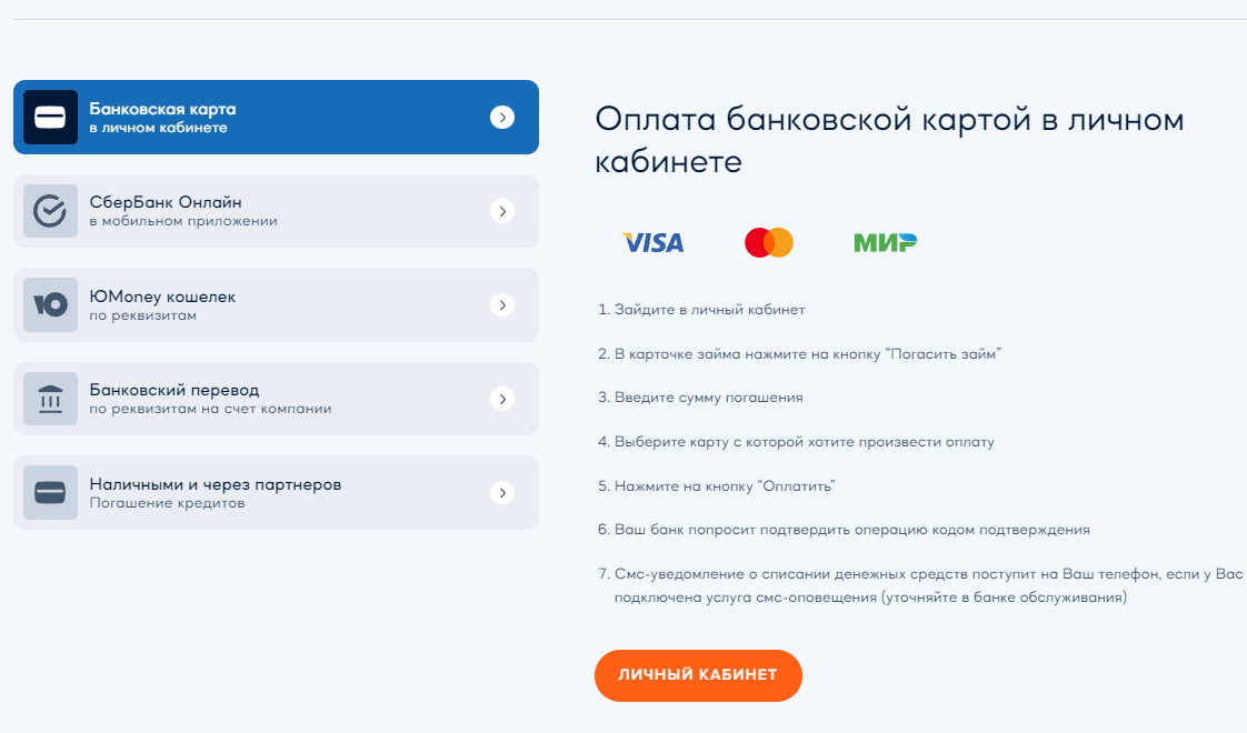 - Авторизуйтесь на сайте компании и перейдите в раздел «Мой займ»