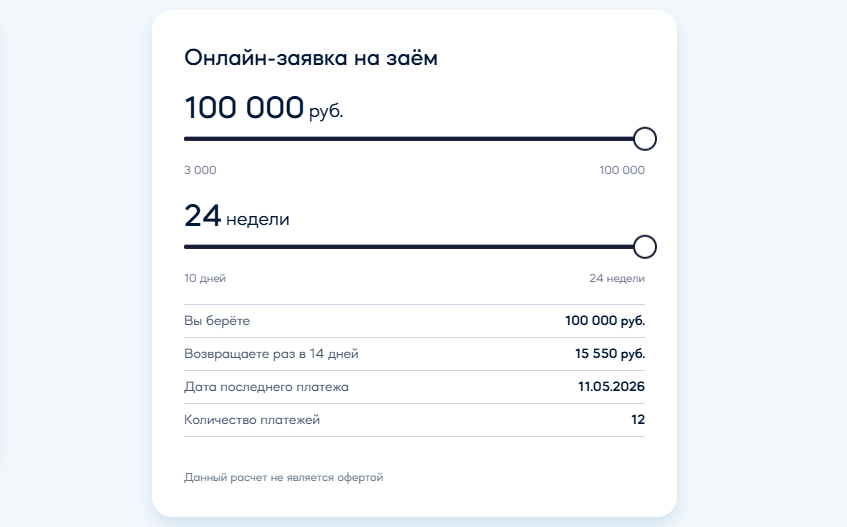 - доступная сумма — от 10 до 100 тысяч рублей;