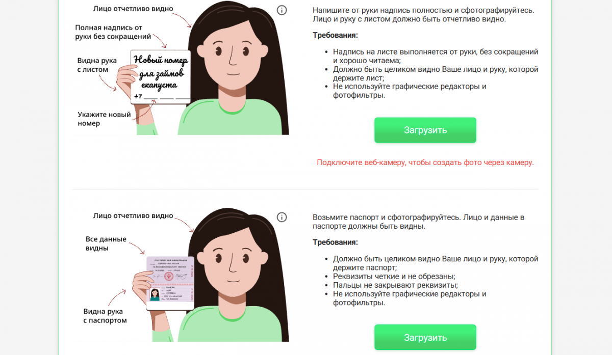 - Загрузите фото с надписью «Заявка на займ в еКапуста», селфи с паспортом, фото первого разворота паспорта и с пропиской