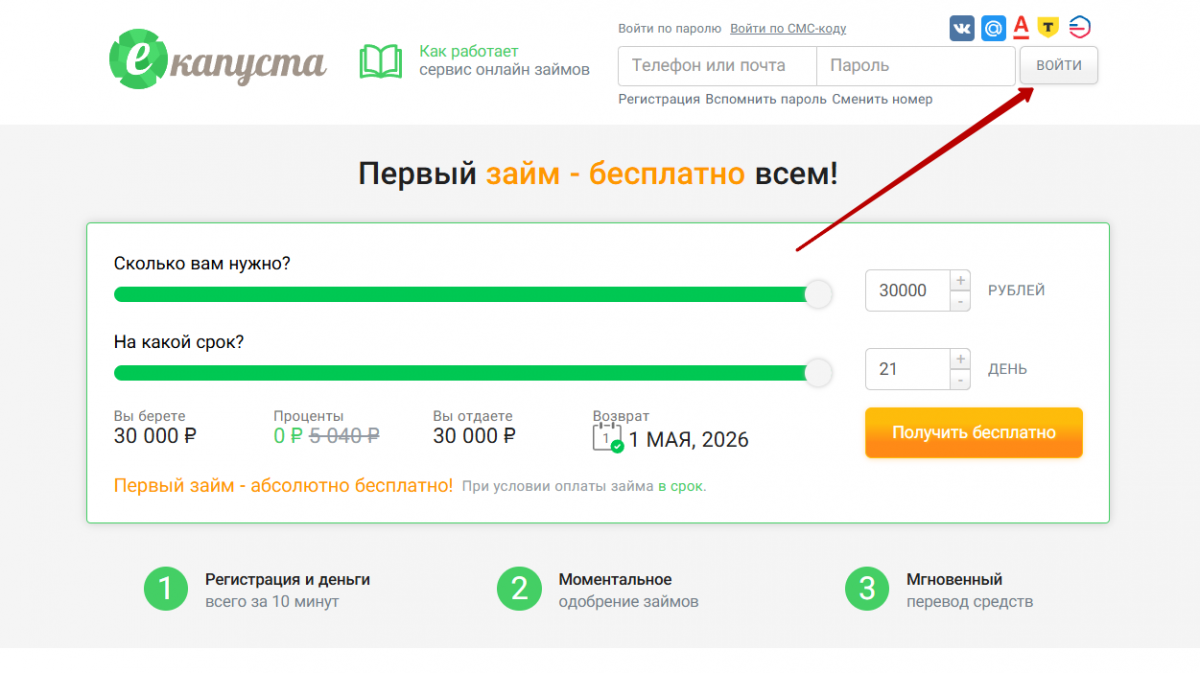 - Откройте сайт еКапуста и выберите сумму и срок микрозайма