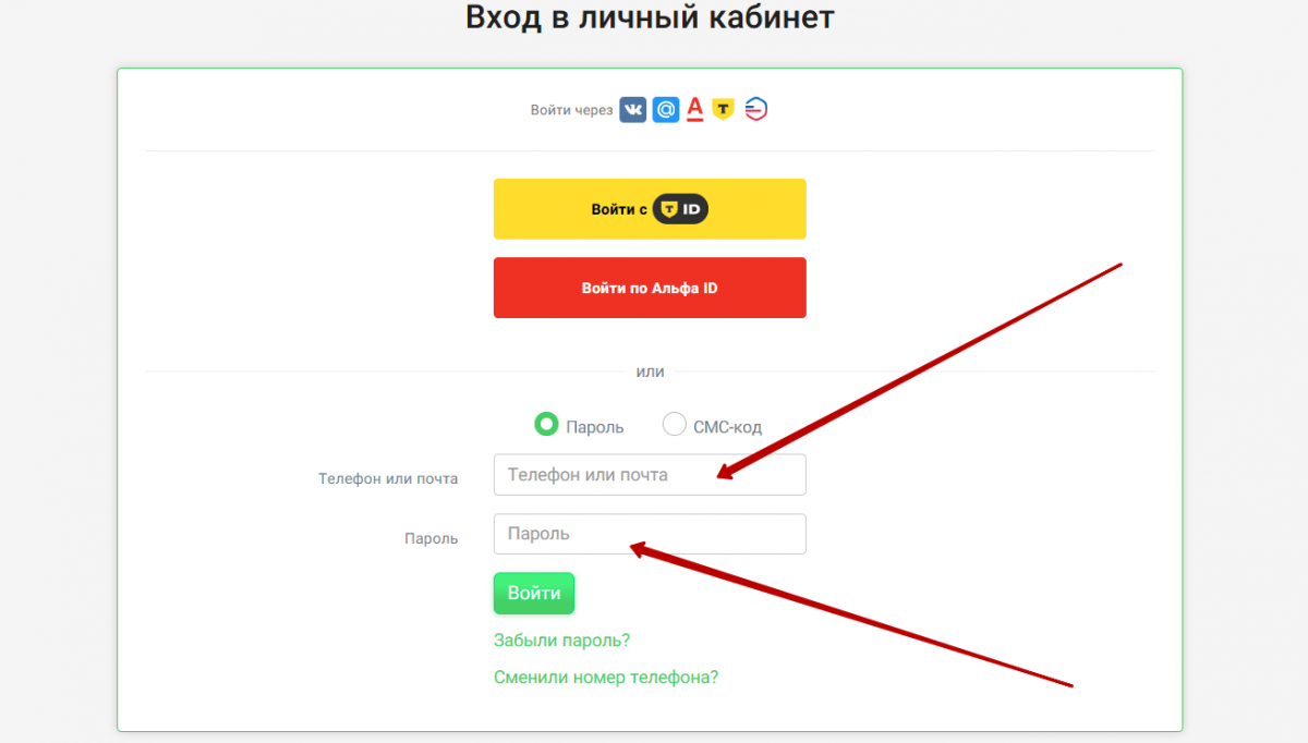 - На странице авторизации вместо «Пароль» выберите «СМС»