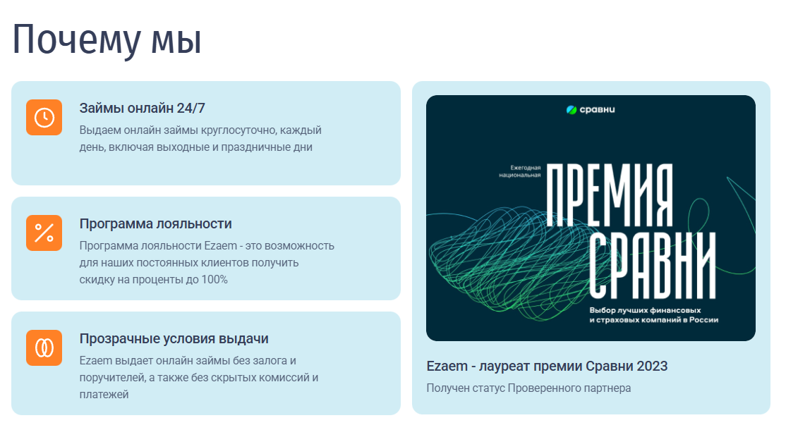 Для упрощения регистрации на сайте: ezaem.ru можно авторизоваться через портал Госуслуги или Т-ID – это сводит к нулю возможность ошибки при вводе данных, а также увеличивает шансы на одобрение.