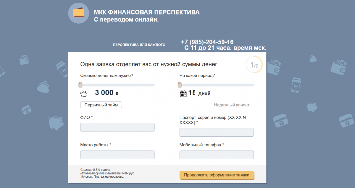МКК Финансовая перспектива специализируется на выдаче займов на длительный срок - до 6 месяцев с лимитом до 35 тысяч рублей. Деньги можно получить наличными или на расчетный счет в банке. Заявки рассматриваются онлайн в течение 20 минут.