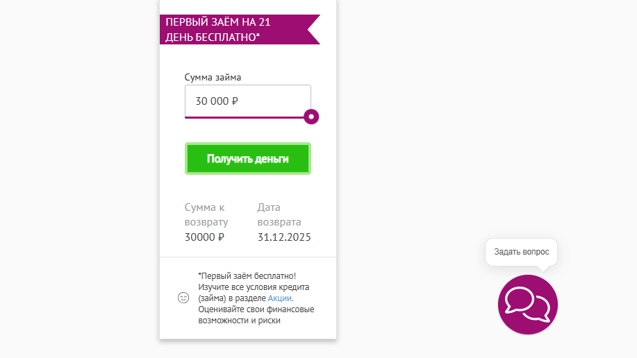 Сумма Срок Одобрение 1500 - 15 000 ₽ 5 - 126 дней 33% Повторно Ставка ПСК До 100 000 ₽ 0 - 0,8% 0 - 292,000% Возраст Ответ Продление 18 - 70 лет 1 минута Да Быстрая регистрация Госуслуги Документы Паспорт РФ, ИНН, СНИЛС Время работы Круглосуточно Способы получения На карту, СБП Погашение Картой Штрафы и пени До 20% годовых от суммы долга Личный кабинет Войти