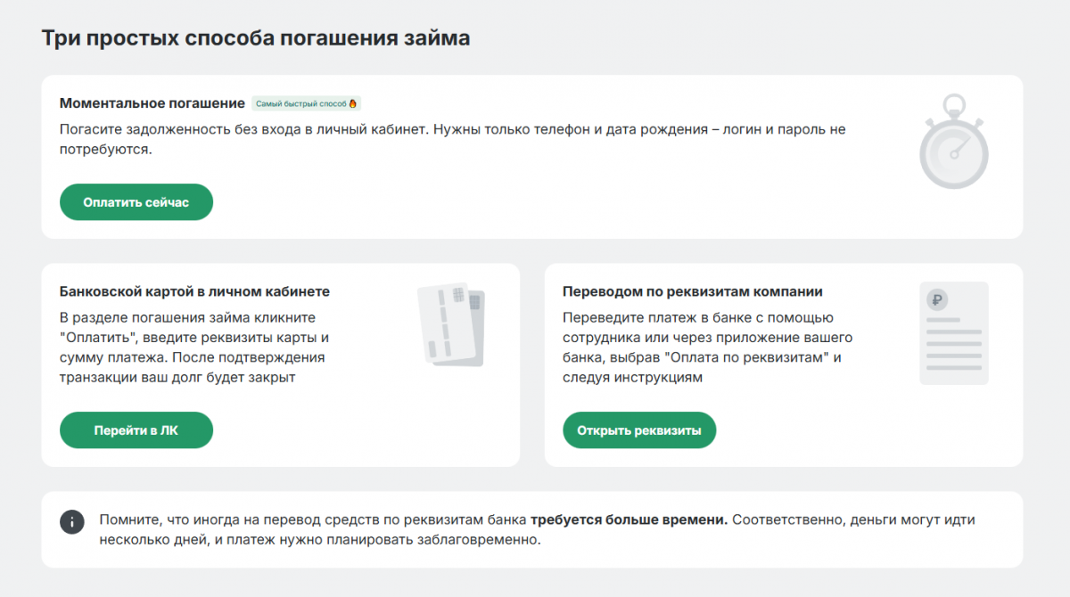 Микрофинансовая организация Финтерс предлагает погасить задолженность 3 способами: переводом по реквизитам без комиссии, банковской картой в личном кабинете и без авторизации на сайте.