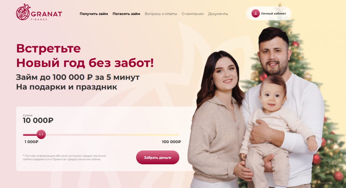 Компания Granat Finance предлагает микрозаймы на сумму от 1000 до 100 000 рублей с максимальным сроком кредитования до 365 дней. Процентная ставка для новых клиентов – 0%, для постоянных – до 0,8% в день или до 292,000% годовых. Доступно частичное или полное досрочное погашение задолженности без штрафов и пени.
