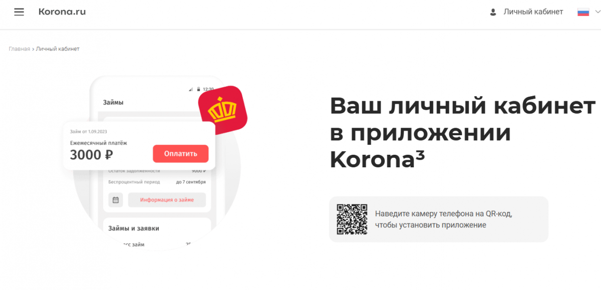 Мобильное приложение Korona позволяет оформлять онлайн займы на карту с беспроцентным периодом, отправлять и получать денежные переводы. Его можно скачать на Rustore, App Store, Google Play или по QR‑код с официального сайта МФО.