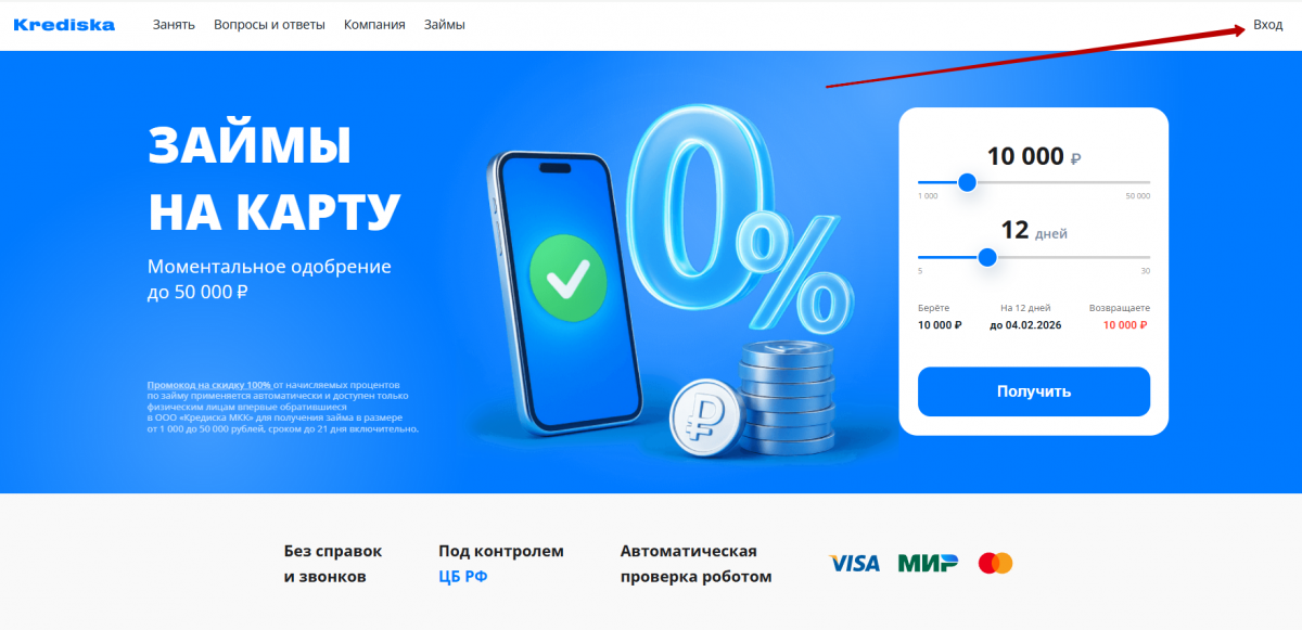 Нажмите на черную ссылку «Войти» в правом верхнем углу сайта krediska.ru и в открывшейся форме укажите номер мобильного телефона, используемый при регистрации. Далее кликните на голубую кнопку «Войти» и дождитесь СМС-код авторизации. После его активации вам станет доступно главное меню профиля.