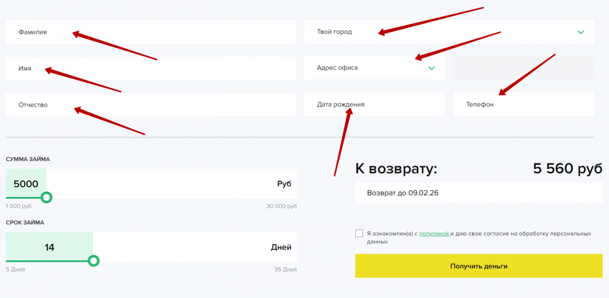 - Нажмите «Получить деньги» и заполните форму заявки персональной и контактной информацией