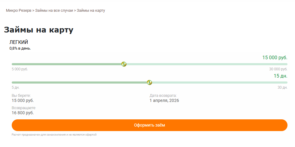 Компания Микро Резерв выдает займы на карту без отказа и проверок на сумму от 5000 до 30000 рублей со сроком кредитования от 5 до 30 дней. Процентная ставка по договору не превышает 292,000% годовых или 0,8% в день. Для оформления потребуется два обязательных документа: паспорт РФ и СНИЛС. Досрочное погашение возможно на любом сроке без штрафов и комиссий. Оплата долга доступна с помощью банковских карт платёжных систем Мир, Visa, MasterCard, а также по реквизитам МФО или наличными в офисе микрокрофинансовой организации.