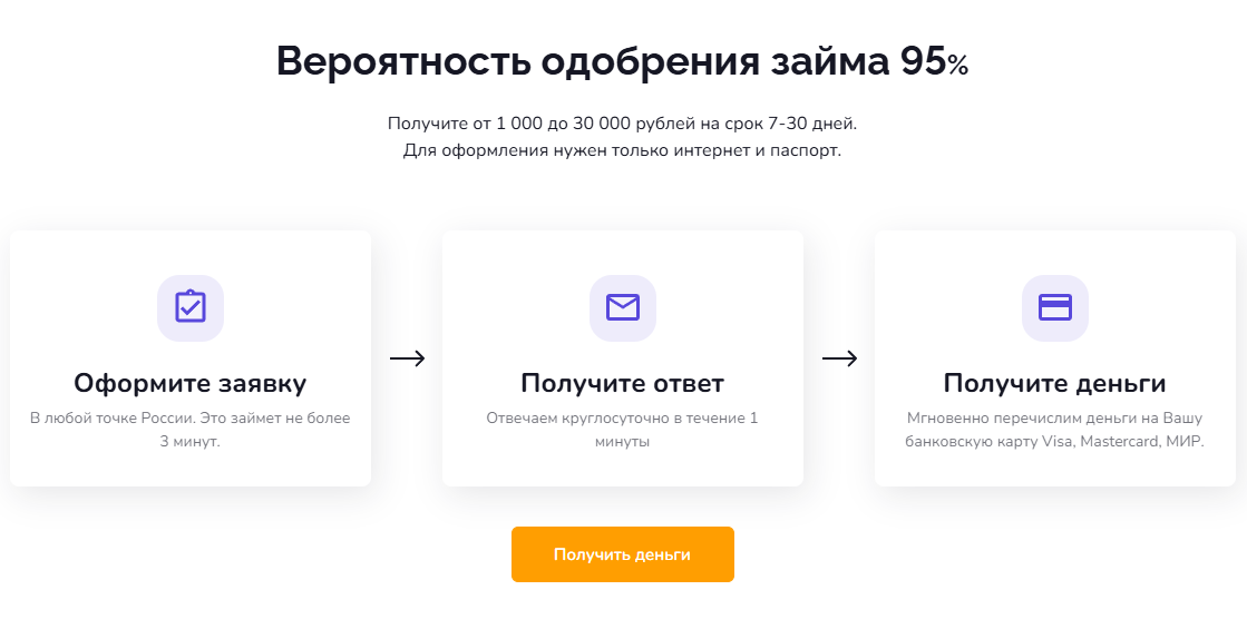 Граждане РФ могут получить от 1000 до 30000 рублей сроком от 7 до 30 дней. Для всех категорий заёмщиков действует фиксированная процентная ставка 0,8% в день или 292,000% годовых. Перевод денежных средств осуществляется на дебетовую банковскую карту любого типа: VISA, MasterCard, Мир. Для привязки карты в личном кабинете потребуется пройти верификацию. Для оформления договора нужен российский паспорт или временная регистрация по месту нахождения офиса МФО, оформленная не менее чем на 6 месяцев.