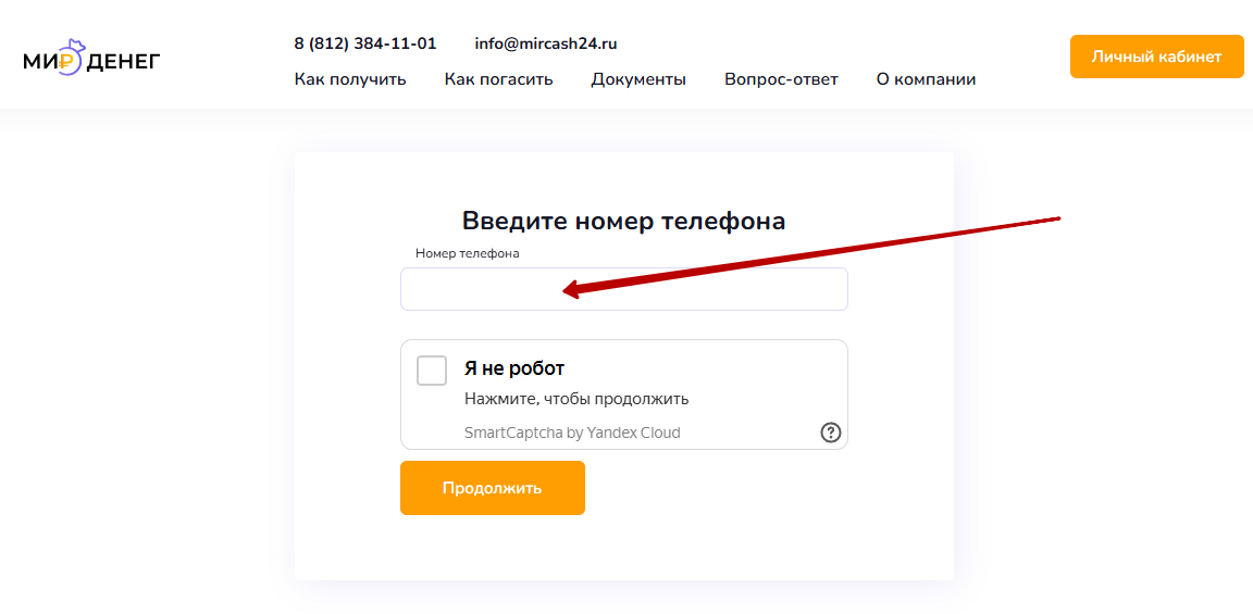 Идентификация в личном кабинете на официальном сайте mircash24.ru происходит по номеру мобильного телефона, указанного при регистрации. Для этого нужно кликнуть на кнопке «Личный кабинет» в правом верхнем углу стартовой страницы и в открывшейся форме указать номер сотового. После чего получить СМС-код и активировать его в специальном окне.