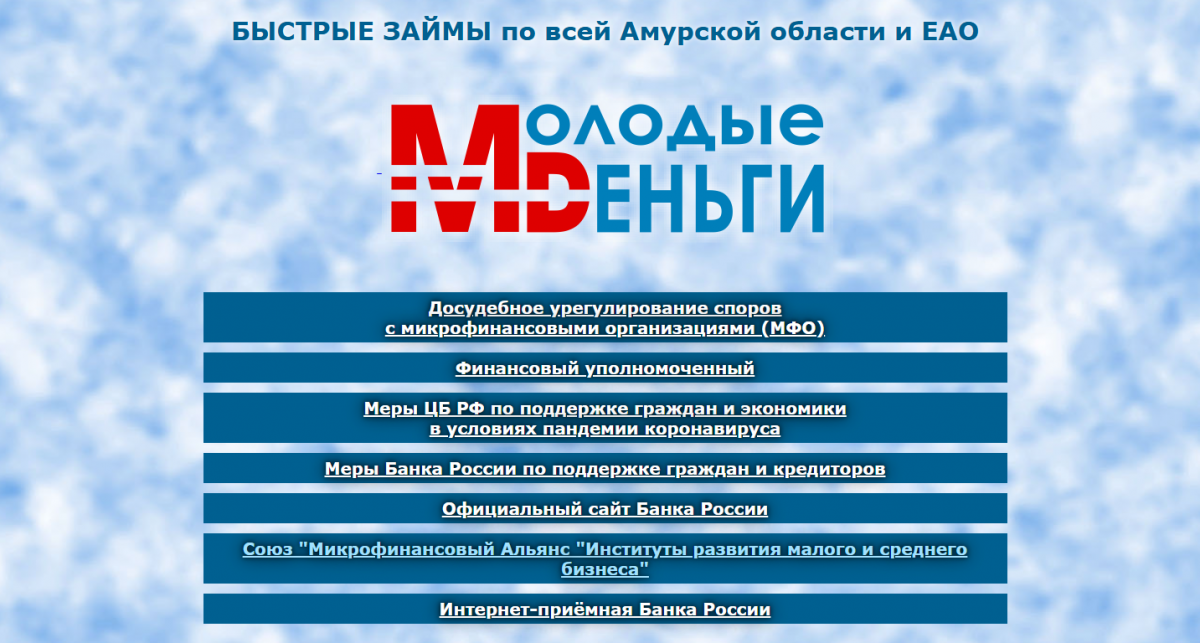 Микрокредитная компания Молодые деньги осуществляет выдачу займов наличными по всей Амурской области и в Еврейской автономной области. МФО числится в реестре ЦБ РФ под №1803045008877 от 20.07.2018 года и является членом Союза «Микрофинансовый Альянас «Институты развития малого и среднего бизнеса». Обращения принимаются в часы работы офиса по местному времени.