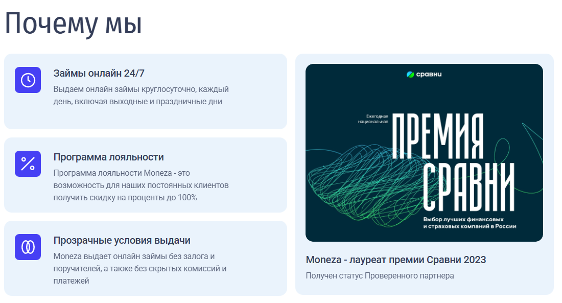 Компания Монеза выдает мгновенные онлайн займы на карту с регистрацией через Госуслуги и Т-Банк в России и странах Европы и Азии, внесена в государственный реестр под №001603045007582 и состоит в профильной СРО. Рассмотрение заявок осуществляется круглосуточно, в любой день недели, без перерывов, выходных и праздников. Для клиентов разработана специальная программа лояльности с кэшбэком от 5% до 20%, накопленные бонусные рубли списываются на оплату процентов или в счет продления срока договора.
