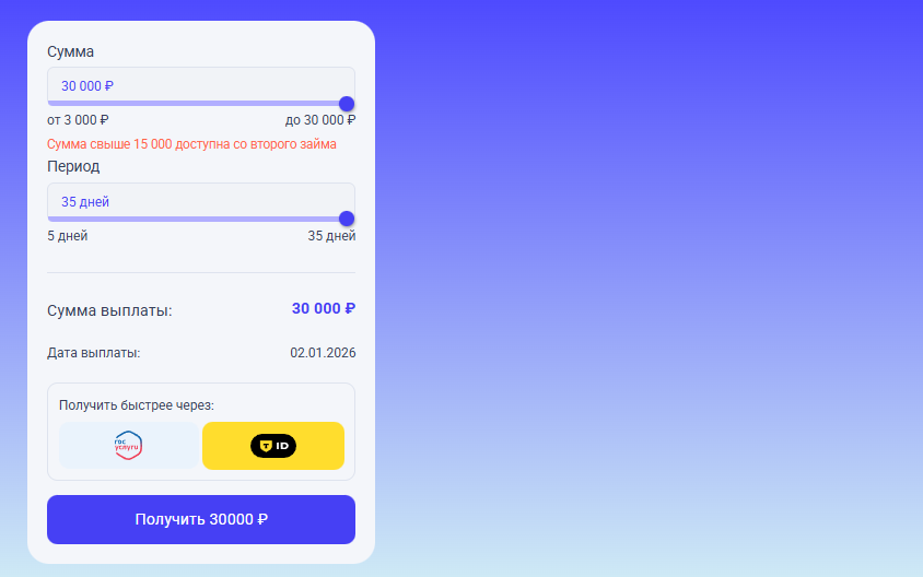 Сумма Срок Одобрение 2000 - 30 000 ₽ 7 - 30 дней 76% Повторно Ставка ПСК До 30 000 ₽ 0 - 0,8% 0 - 292,000% Возраст Решение Продление 18 - 75 лет 2 минуты Да - 0%