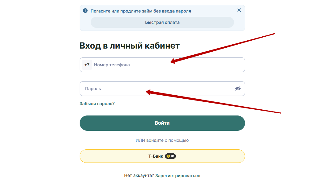Погасить займ можно без входа в личный кабинет, используя форму для быстрой оплаты. Для этого выполните несколько шагов: