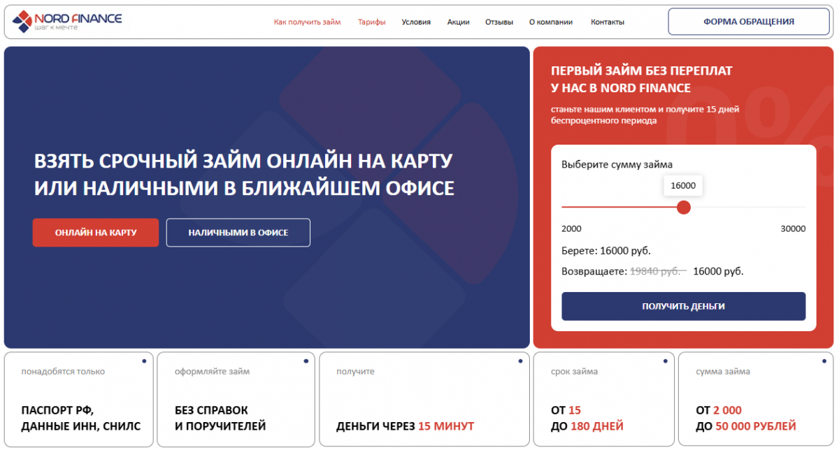 Микрокредитная компания Норд Финанс предлагает своим клиентам сразу 4 программы кредитования. Займы выдаются только по одному документу на срок от 15 до 180 дней с максимальным лимитом 50 тысяч рублей. Для новичков действуют льготные условия - деньги выдаются бесплатно.